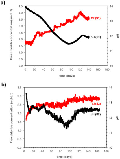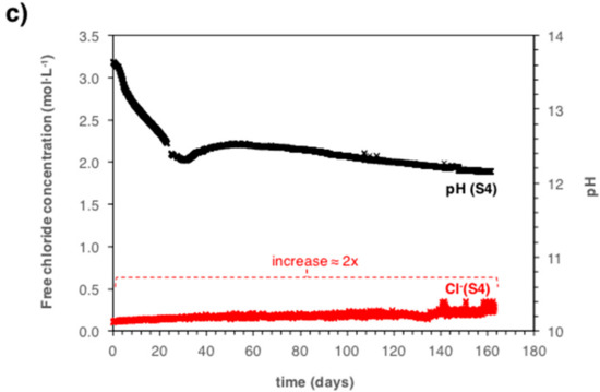 From Figure 5, it can be seen that the free chloride concentration increased significantly when the pH of the pore solution decreased. This increase in free chlorides is most pronounced when the pH changes over the range pH 13.5–12.5. This behavior has also been reported elsewhere [39]. For sample S1, the free chloride concentration increased 1.2-fold, with respect to the initial value, when the pH decreased down to pH ≈ 12.5 and about 1.5-fold when the pH decreased down to pH ≈ 11.5. For samples S2 and S4, the free chloride concentration increased between 1.5 and 2-fold down to pH ≈ 12.5.