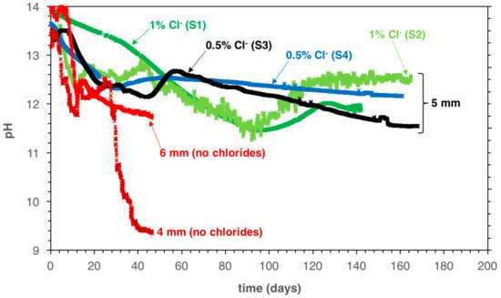 Another interesting result found in this paper is that the samples with 1% of admixed sodium chloride showed a more pronounced but slower pH drop before the pH bounced back to pH ≈ 12.5. This decreasing and recovering effect was in Reference [34] and was explained by the dissolution kinetics of Portlandite, which are likely different in the case of admixed chloride. In fact, data from a previous study [34] indicated that carbonation of chloride-free mortar samples is faster than carbonation of chloride-containing mortar. To illustrate this, Figure 6 shows the measured pH as a function of exposure time in the carbonation chamber at 4 and 6 mm cover depth for chloride-free specimens (same experimental set-up, curing time = one week) and at 4 mm cover depth for the samples with admixed chlorides used in this study (S1, S2, S3, and S4; curing time = 3 days).