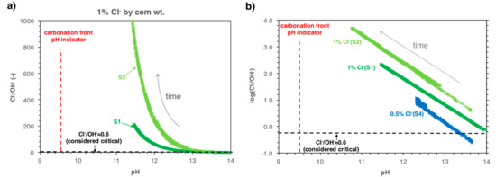 In this work, it was found that when the pore solution pH decreases, the free chloride concentration increases (see Figure 5 and Section 6.1). Therefore, upon carbonation of chloride-containing concrete, the Cl−/OH– ratio not only increases because of a decrease in OH– (factor 10 by one pH unit), but also because the Cl− concentration increases simultaneously (Figure 5). As a consequence, the risk of corrosion initiation can become significantly higher during the progress of concrete carbonation, even before full carbonation and even if initially the amount of chlorides was considered not critical. Figure 7a shows the measured Cl−/OH− ratio as a function of the pore solution pH for mortar samples containing 1% admixed chlorides. Figure 7b shows the logarithm of the measured Cl−/OH− ratio as a function of the pore solution pH for mortar samples containing 1% and 0.5% admixed chlorides. The carbonation front typically determined with the phenolphthalein (pH-indicator) spray method (pH 9–10) [56,57] and the critical ratio Cl−/OH− of 0.6 suggested by Hausmann [53] is also indicated in the graphs by means of red and black dashed lines, respectively.
