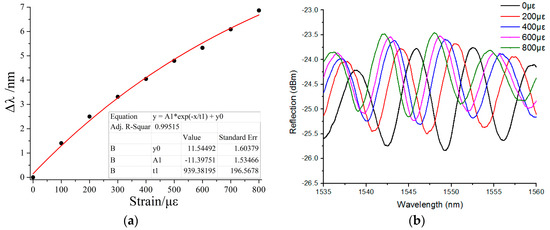 In this corrected figure, the data was fitted in exponential, but not linear function [1]. The authors regret this mistake. Thus, the fitted function can be depicted as Δλ = −11.39751 × exp(−δ/939.38195) + 11.54492. The corresponding sensitivity S could be calculated by differentiating the upper formula, which is S = 0.012133 × exp(−δ/939.38195), and the maximum strain sensitivity of the proposed microbubble is 12.133 pm/με.