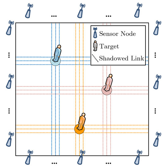The DFL technique can empower existing wireless infrastructures with the ability of location awareness while, at the same time, do not disturb the normal communication tasks [7]. In DFL, the location information of transceiver-free targets is estimated by analyzing the target-induced perturbations in the radio frequency (RF) field. In the literature, based on how to utilize the radio signal measurement information, the DFL approaches can be categorized into three types: geometry-based approaches, fingerprinting-based approaches, and radio tomographic imaging (RTI)-based approaches [8]. The geometry-based DFL approach utilizes the geometry information of shadowed links for location estimation [9,10,11], which needs a prior knowledge of the deployment of wireless links and has a low localization accuracy. The fingerprinting-based DFL approach can improve the localization accuracy [12,13], but a labor-intensive and time-consuming site survey is required to build and retraining the radio map to maintain fingerprint-location matching. The RTI system can locate targets accurately based on the principle of computed tomography (CT) [14,15]. However, a sufficient number of wireless links is required to cover the monitoring area, which may incur high energy consumption and high hardware cost.