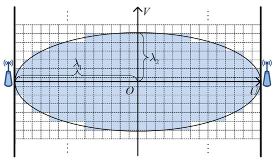 where denotes the maximum shadowing loss on the LOS path, denotes the shadowing ratio that is the normalized shadowing loss at the midpoint of the LOS path. Only the targets within the spatial impact area of link m can cause a nonzero . Figure 2 depicts the spatial impact area of a wireless link, which is an ellipse between the transmitter and receiver. As shown in Figure 2, a U-V coordinate system is built in the spatial impact area. The midpoint of the LOS path is taken as the origin of the coordinates. The U-axis coincides with the LOS path, and the V-axis is vertical to it. In Equation (8), denotes the coordinate of grid n under the U-V coordinate system of link m. and denote the semi-major and semi-minor axes of the elliptical spatial impact area, respectively.