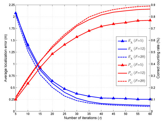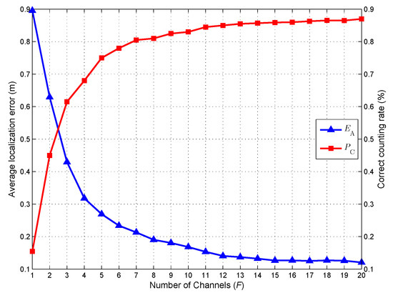 In the second simulation, we test the effect of the channel number F on the target counting and localization performance of the proposed method. Figure 5 shows the average localization error and correct counting rate as functions of the channel number F. The figure illustrates that increasing F has a positive effect on both quantities. This trend is consistent with the fact that increasing the number of channels, more useful information will be provided for the target counting and localization. The simulation results confirm the effectiveness of the proposed method for exploiting the frequency diversity of CSI measurements. With the increase of F, decreases and increases accordingly. However, when , very little performance improvement can be obtained by increasing the channel number F. In fact, a large F means a complex Bayesian model and the posteriors of more stochastic variables need to be inferred. For this analysis, an excessively large F may have a negative effect on the accuracy of the posterior inference. When , the negative effect of increasing the complexity of the Bayesian model will almost offset the positive effect contributed by increasing the frequency diversity of CSI measurements. In view of this, we choose the channel number as our default setting.