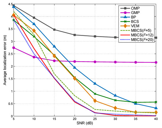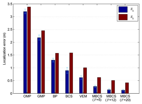 In the following, we compare the localization accuracies of the proposed method and the CS-based multi-target DFL approaches that using the following sparse recovery algorithms: OMP, BP, GMP, BCS, and VEM (these abbreviations are explained at the end of the article). Figure 6 depicts the average localization error and root-mean-square localization error of these DFL approaches. The confidence interval of is also shown in this figure. As can be seen, the proposed method significantly outperforms all the other approaches in terms of both and . Furthermore, we can also see that the Bayesian methods (i.e., BCS, VEM, and MBCS) can achieve a better performance than other methods. Particularly, although the improvement on of the proposed method is only m by increasing the channel number F from 12 to 20, the corresponding reduction in is m. This indicates that the increase in the number of channels can lead to a more robust localization performance.