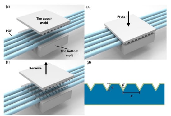 A commercial step-index POF (DD-1000, Jiangxi Daishing POF Co., Ltd., Jinggangshan, China) was used to fabricate the sensing probe. The core material of the POF is polymethyl methacrylate (PMMA) with a diameter of 980 μm, refractive index of 1.49, and thermo-optic coefficient of −1.15 × 10−4 °C−1, while the cladding material is a fluorinated polymer with a thickness of 10 μm, a lower refractive index of 1.41, and thermo-optic coefficient of −3.50 × 10−4 °C−1. The POF sensor probe was fabricated by a simple mechanical die-press-print method, as shown in Figure 1a–c. The POFs are placed into the U-shape slots (the diameter of the slot is about 1 mm) of the bottom metal mould, and an upper metal mould with a V-groove structure is pressed on the POFs, with the V-groove structure of the mould being perpendicular to the fiber axis. By keeping this state for a few seconds before removing the mould, the V-groove structure could be transferred onto the POFs. The structure parameters could be altered, with the V-groove pitch and angle changed using metal moulds with a different V-groove pitch and angle, respectively. The V-groove depth on the POF could be tuned by controlling the pressure and it was measured by using an optical microscope. The schematic of the V-groove structure on the POF is shown in Figure 1d. This preparation method is suitable for mass production.
