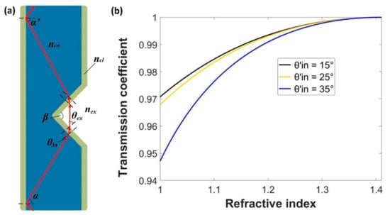 where θ′in is the incident angle at the cladding and the external medium interface, θex = arcsin[nclsin(θ′in)/nex], is the corresponding refraction angle at the cladding-medium interface in the V-groove region, and nex is the refractive index of the external medium in the V-groove region. It can be found that the transmission coefficient, T, is expressed as a function of the incident angle, θ′in, and the refractive index of the external medium, nex.