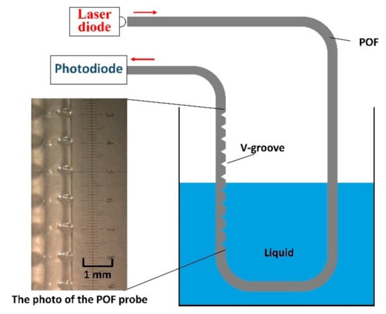 Figure 3 shows the experimental setup of the proposed liquid level measurement system. A laser diode (TLS001-635, Thorlabs, Newton, NJ, USA), with a wavelength of 635 nm and a launched power of 1 mW, was used to generate a laser beam. A photodiode (S120, Thorlabs, Newton, NJ, USA), with a responsivity of 0.41 A/W at 635 nm and a resolution of 1 nW, was used to detect light signals at the POF output end. The POF probe was fixed straight on a ruler and placed vertically inside the beaker. The V-groove structure faced the opposite side of the ruler. Glycerin solutions with different concentrations were used as specimens to examine the sensor performance. Refractive indices were measured by an Abbe refractometer and described by the relation of n = 1.33 + 0.13C, where C is the volume concentration of the glycerin. The experiment was performed at a room temperature of 25 °C.