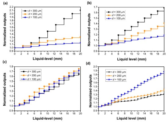 The influences of the V-groove depth and pitch of the POF probes on the liquid level sensing performances were investigated, as shown in Figure 4a–d, which presents the relation between the normalized outputs and liquid level for the probes with different V-groove pitches of 2.5, 2.0, 1.5, and 1.0 mm, and with the V-groove depths of 100, 200, and 300 μm, respectively. The V-groove angle of the probes was 60°. The uncertainties of the V-groove pitch, depth, and angle were ±20 μm, ±10 μm, and ±3°, respectively. The glycerin solution with a refractive index of 1.39 was used as the specimen. The normalized output power equals Pi/P0, where Pi and P0 are the output power measuring in the glycerin solution and in air, respectively. The sensitivity is determined as the ratio of the normalized output power variations to the corresponding liquid level changes. The liquid level position before the first V-groove structure was set as the zero-level position. From the experimental results, it was found that, when the V-groove structure was immerged by the liquid, the output power increased, while as the liquid level changed at the straight POF sections, it remained stable; thus, the response curves of the sensor probes appear as a step ladder with rising liquid levels.