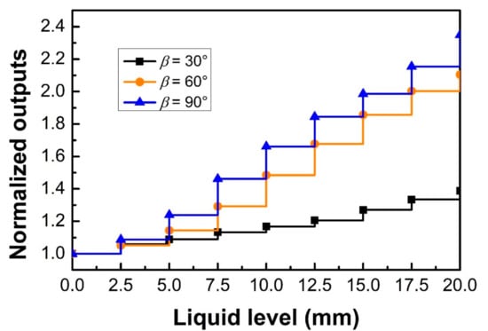 The influence of the V-groove angle on the liquid level sensing performances was investigated, as shown in Figure 5. The V-groove pitch and depth of the tested sensing probe were 2.5 mm and 300 μm, respectively. Additionally, the V-groove angles were 30°, 60°, and 90°, respectively. The refractive index of the liquid was 1.39. The results from Figure 5 are shown in Table 2. It is found that the probe with a V-groove angle of 90° had the highest sensitivity of 0.0698 mm−1. This may be because more light power will be modulated for the probe with a V-groove angle of 90°.