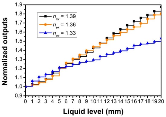 Figure 2b shows the relation between T and nex ranging from 1 to 1.41 for different incident angles. It is found that the value of T increases when the incident angle decreases at the cladding-medium interface, and it is also found that as the refractive index of the external medium in the V-groove region increases, T increases. If the refractive index of the surrounding medium is low (e.g., nair = 1), some of the light power could still be guided in the fiber cladding, in this case, the value of T decreases. While for the surrounding medium with a higher refractive index, for example 1.41, which is the same as the refractive index of the fiber cladding, all the modes guided through the cladding are refracted outside the fiber, so T increases. The situation is the same for the light coupled from the V-groove region into the POF. The liquid in the V-groove region could decrease the reflection at the external medium-cladding interface and make more light power couple back to the POF. Thus, when the V-groove structure is immersed by the rising liquid, whose refractive index is higher than that of air, more light power could be transported from one side of the V-groove structure to the other side, which makes the output power increase accordingly. Thus, it is possible to measure liquid-level changes by employing the probe with a cascading V-groove structure. The total output power of the POF probe is the sum of all the light rays propagated in the initial POF, which refract into the fiber cladding, undergo coupling at all the V-groove regions, and finally reach the last POF output end. Of course, some of the light rays will be directly lost in the V-groove regions.