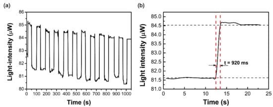The dynamic performance (a) and the measured response time (b) of the sensor where the V-groove pitch, depth, and angle of the sensor probe are 1 mm, 100 μm, and 60°, respectively, and the refractive index of the testing liquid is 1.39.