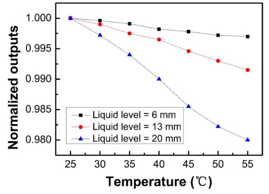The temperature effect of the sensor was also tested, as shown in Figure 8. The test was carried out with different liquid levels of 6, 13, and 20 mm, respectively. The refractive index of the liquid was 1.39 and the temperature was changed from 25 °C to 55 °C, with a step of 5 ± 1 °C. The V-groove pitch, depth, and angle of the sensor probe were 1 mm, 100 μm, and 60°, respectively. The normalized output power equals Pt/P25, where Pt and P25 are the output power measuring the temperature of t °C and 25 °C, respectively. The experiment results showed that as the temperature increases, the sensor output decreases. It is also found that the more the V-groove structure was immerged, the more obvious the temperature effect was, and when all the V-groove structure was immerged by the liquid, the sensitivity to temperature was 0.0007 °C−1, which was about two orders lower than the one to the liquid level. This is because the influence of temperature on the sensing performance can be divided into two aspects []. One is the thermal optic effect of the testing liquid, which is the higher the liquid level measures, the more significant the effect is. The other aspect is the thermal optic effect and thermal expansion effect of the sensor probe, with the material properties and the numerical aperture of the POF able to be altered by changes of temperature. The two aspects will cause a subtle change in the output power, resulting in a measurement error. However, it is easy to distinguish output changes caused by liquid level and temperature variations of the proposed sensor, for when the V-groove region is immerged or emerged by the liquid, a quick and sharp output change will be found, while for the temperature variation, the response time of the sensor is long. Therefore, the influence of temperature in the moderate range could be ignored for this liquid level sensor. However, if the change of temperature is too high, for example over 70 °C, the temperature effect must be considered, for the transmission properties of the light in the POF will be severely affected.