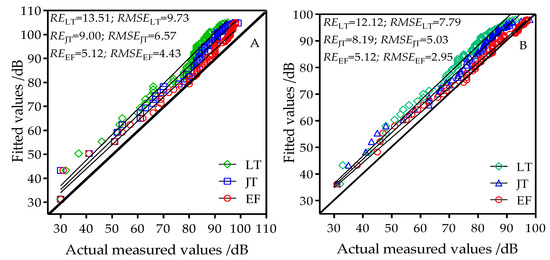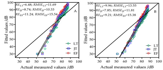 The root-mean-square error (RMSE) and relative error (RE) were used as precision indicators for predicted path loss in the models. As these values approach 0, the prediction precision increases. The calculation formula is as follows: