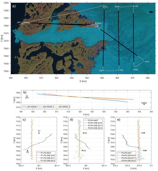 Survey overview: (a) ground track of the entire survey (white) along with line profiles (black) on top of Landsat-8 image from 9 August 2016; (b) ground track of the three repeat lines between Ilulissat Airport (JAV) and Kangia North GPS station (KAGA); (c) ground track of the profiles between P1 and P2; (d) ground track of the profiles between P3 and P4; (e) ground track of the profiles between P5 and P6. Coordinates are with respect to UTM zone 22. Notice the difference in scale between the x- and y-axes.