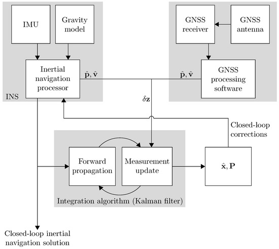 The GNSS position estimates are only used to initialise the position for inertial navigation, meaning that the INS and GNSS navigation solutions are independent. The GNSS system provides estimates of position and velocity, while the INS provides estimates of position, velocity and attitude. These two estimates are combined in a cascaded (loosely coupled) approach using an Empirical Kalman Filter (EKF). The Kalman filter framework revolves around a linear dynamic system model ([23] (Equations (4)–(102))):