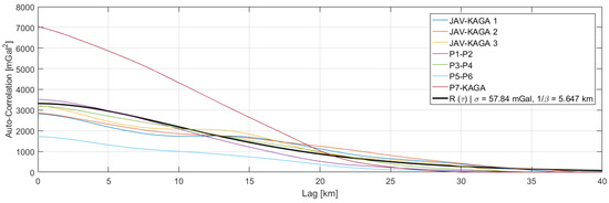 Estimated autocorrelation functions for the seven profiles along with the (least squares) best fitting third-order Gauss–Markov autocorrelation function. The parameters = 57.84 mGal and = 5.647 km.