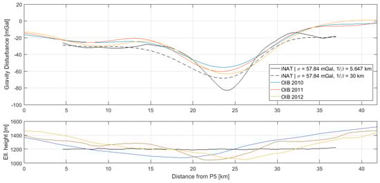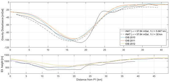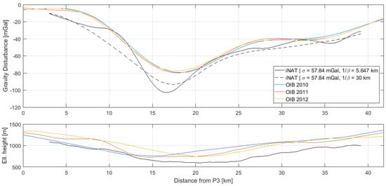 The AIRGrav instrument was carried by a fixed-wing aircraft flying at approximately 134 m/s, whereas the iNAT instrument was flown in a helicopter at approximately 52 m/s. Therefore, the iNAT gravity profiles have a higher spatial resolution than the OIB profiles. This is also evident from the figures, indicating that the glacier gravity anomaly is more sharp than indicated by the OIB profiles. Since the correlation length of the Gauss–Markov stochastic process will influence the resolution of the gravity profile, it was increased in order to arrive at gravity profiles with a resolution similar to that of the OIB estimates. The optimal similarity in terms of Root-Mean-Square (RMS) difference occurs around km. The resulting profiles are also shown in the above figures and the statistics of the differences are shown in Table 6.