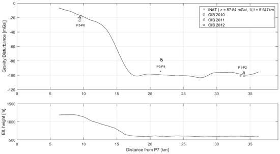 Profile along the P7-KAGA line which crosses over the three OIB lines: (top) gravity disturbance profile along with values from crossing lines; (bottom) height profile.