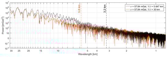 Due to the significant variation in estimated spatial resolution, a conservative estimate is 4.5 km, where the power spectrum reaches the magnitude level. Also shown in the figure is the power spectrum for the over-smoothed solution, i.e., with km, containing less power in the 6–20 km wavelength interval. Using the same approach as before, the spatial resolution was estimated to 5.8 km with a standard deviation of 1.1 km. Since these estimates were tuned to mimic the AIRGrav OIB profiles, the expected spatial resolution is 6.7 km, which is within the confidence bounds. Some inconsistency may also originate from the filter, since the shape of the filter applied in the AIRGrav processing is unknown to the authors.