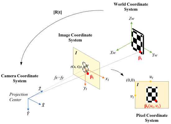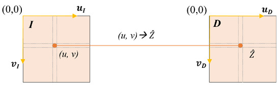 The estimated point cloud is generated by detecting corners on the checkerboard intersections. Specifically, the image coordinates , of each corner point are automatically detected by checkerboard corner detection algorithms [46]. Using the 2D coordinates as indices to access the depth map D, the estimated depth of the point is collected, allowing the other two coordinates and of to be computed by plugging and in Equation (3). This process is shown in Figure 3.