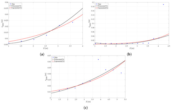 RMS error for (a) Kinect v1, (b) Kinect v2 and (c) ZED, represented for polynomial and exponential models.