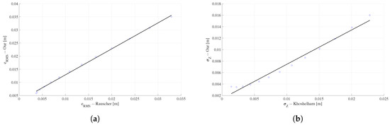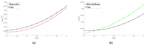 Dispersion graphs of Kinect v1 depth errors curves, (a) Rauscher et al. [2] vs. our RMS error () and (b) Khoshelham and Elberink [5] vs. our standard deviation of the depth error ().