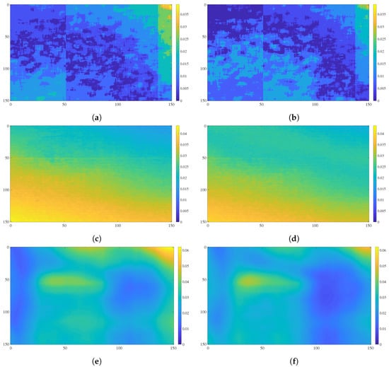 Comparison of the average RMS error in meters (for each pixel in a central window of 150 × 150) of 300 depth maps captured with Kinect v1 (640 × 480 px), Kinect v2 (512 × 424 px) and ZED camera (672 × 376 px), (a,c,e) before and (b,d,f) after a simple correction process. The more yellow the pixels are, the more RMS error exists.