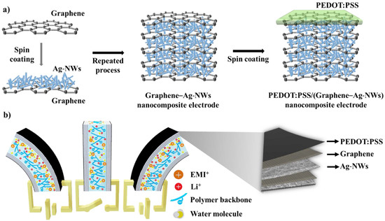 Schematic diagrams of IEAP actor based on PEDOT:PSS/(graphene–Ag-NWs) nanocomposite electrodes: (a) synthesis of a PEDOT:PSS/(graphene–Ag-NWs) nanocomposite electrode; (b) design of IEAP actuator based on PEDOT:PSS/(graphene–Ag-NWs) nanocomposite electrodes.