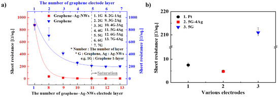 (a) Sheet resistance of graphene–Ag-NW composites and graphene according to the number of layers; (b) Sheet resistance Pt, 5G–4Ag, and 5G electrodes.