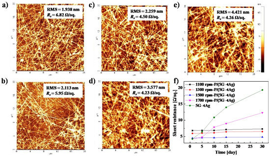 AFM images of the PEDOT:PSS-coated 5G–4Ag electrode prepared at different spinning speeds: (a) 1100 rpm; (b) 1300 rpm; (c) 1500 rpm; (d) 1700 rpm; (e) Uncoated 5G–4Ag electrode; the inset shows the RMS roughness and Rs of each sample; (f) Changes in sheet resistance during a period of 30 days in a natural environment.