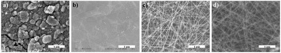 SEM images of fabricated electrodes: (a) Pt; (b) 5G; (c) 5G-4Ag; (d) P/(5G–4Ag).