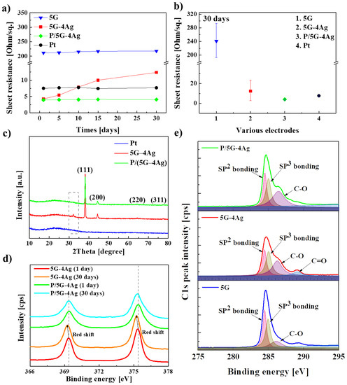 Figure 6d shows the XPS spectra about the Ag 3d peak of various electrodes [44]. In general, the Ag 3d peak can be separated to Ag 3d3/2 peak and Ag 3d5/2 peak. The Ag 3d3/2 peak is caused by down-spin electrons in the d-orbital in the M-shell of silver, while the Ag 3d5/2 peak is caused by up-spin electrons at the same position as those related to Ag 3d3/2. The XPS spectra of the electrodes, except for the 5G electrode, all exhibit the Ag 3d3/2 peak and Ag 3d5/2 peak at 369 and 375 eV, respectively. The binding energy associated with each Ag 3d peak is slightly shifted (by ~0.2 eV) toward lower values for uncoated electrode. Generally speaking, Ag2O and AgO have binding energies that are 0.3–0.6 eV lower than Ag owing to the lowered binding energy when oxidation of Ag occurs. Therefore, the shift of the peak towards lower value indicates the formation of silver oxide. Figure 6e shows the XP spectra of the C 1s peak according to the binding energy of the electrodes. The synthesized graphene exhibited a complex C 1s spectrum containing contributions from sp2 and sp3 bonding. The sp3 carbon peak is positioned 1.0 eV away toward the higher binding energy side) from the sp2 peak. There were more sp2 carbon than sp3 carbon caused by C–C bonding in the CVD-grown graphene, and a C–O bonding peak was observed. The sp2 and sp3 bonding peaks have lower intensity in the spectrum of the uncoated nanocomposite than in the spectrum of the 5-layered graphene. C–O and C=O bonding peaks were also observed. However, the sp2 and sp3 bonding peaks of in the spectrum of the PEDOT:PSS-coated nanocomposite have higher intensity, and the intensity of the C–O bonding peak remains unchanged owing to the PEDOT:PSS coating with C–C and C–O bonding. Moreover, the peak caused by C=O bonding was not observed in the spectrum of the uncoated 5G–4Ag nanocomposite. Consequently, as shown in Figure 6, when the electrodes were exposed to the outside for a long time, the increase in sheet resistance was caused by the oxidation of carbon and silver in 5G and 5G–4Ag. In addition, we found that the oxidation of an electrode could be improved through the PEDOT:PSS coating.