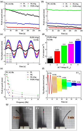 Figure 7c shows the harmonic responses of the P/5G–4Ag actuators under five different driving voltages (1–5 V) at an excitation frequency of 0.2 Hz. As the driving voltage increased, the tip displacement of the P/(5G–4Ag) actuator increased. The maximum tip displacement of the P/(5G–4Ag) actuator reached 0.55, 1.49, 2.37, 2.67, and 3.13 mm under input voltages of 1, 2, 3, 4, and 5 V, respectively. By using Equation (3), the bending curvatures (κ) were calculated as shown in Figure 7d. We obtained κ = 1.359, 3.515, 5.130, 5.623, and 6.521 m−1 under the input voltages of 1, 2, 3, 4, and 5 V, respectively. Moreover, the bending performances of all actuators were measured under an input voltage of 5 VAC at various frequencies from 0.2 to 10 Hz, and the results are shown in Figure 7e. The P/(5G–4Ag) actuator showed the best actuation performance compared with other actuators at various frequencies, and it showed stable actuation performance at high frequency (Figure 7f). The photograph of Figure 7g shows images of the bending P/(5G–4Ag) actuator under the input voltage of 5 VDC after 3 min (instantaneous time). Therefore, these results demonstrate that the application of the P/(5G–4Ag) nanocomposite to both electrodes greatly improved the overall actuation performances (such as the fast response rate, durability and stability) of soft ionic actuators.