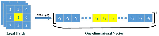 To overcome this issue, we adopt a spatial–spectral feature-based dictionary learning method. Although anomaly detection techniques rely upon the spectral difference between pixels, there are spatial correlations for neighbourhood pixels, so collaboration considering the spatial–spectral feature can effectively improve the detection result [40,52,53,54]. Inspired by this, we replaced each single pixel with its surrounding pixels to form a local patch before the clustering and dictionary learning step. Specifically, for a given hyperspectral pixel x, we selected an size 3-D local patch whose center is x. This 3-D patch was then reshaped to be a one-dimensional vector. Figure 1 takes a size patch and 3 spectral bands to show a brief example of this approach. The new reshaped matrix gives a good integrated representation of spatial-spectral features simultaneously.