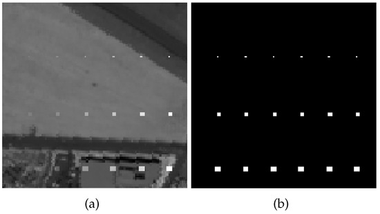 In the synthetic image, 18 anomalous targets have been implanted. They are distributed in three rows and six columns and the sizes of anomalous are , , and , from top to bottom in each column. In each row, the abundance fractions are 0.1, 0.2, 0.4, 0.6, 0.8, and 1.0, from left to right. The spectrum of the plane is assumed to be the anomalous spectrum , which is chosen from the middle left of the whole scene. The simulated data and ground truth are shown in Figure 4.