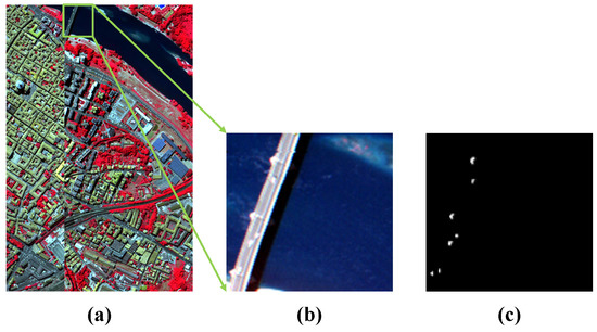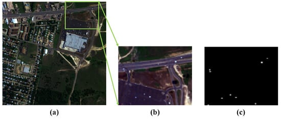 HYDICE hyperspectral image named Urban. (a) Whole HYDICE hyperspectral image; (b) Upper left of the scene. (c) Ground truth for the anomaly targets.