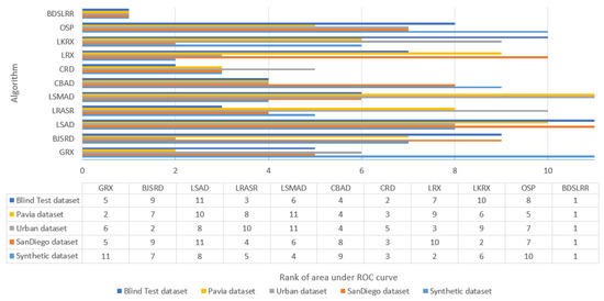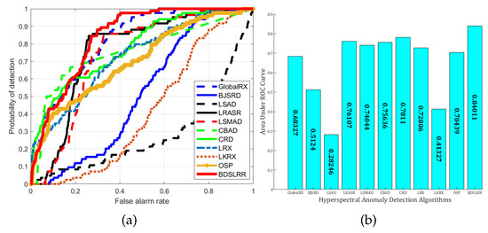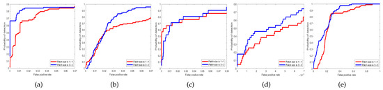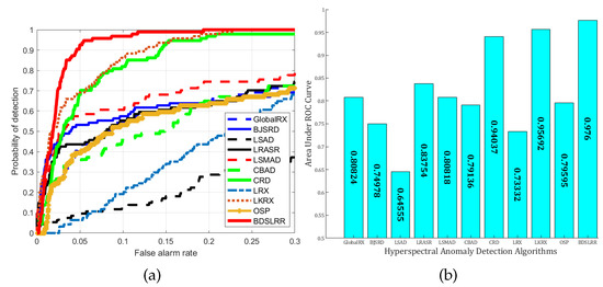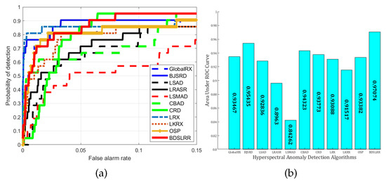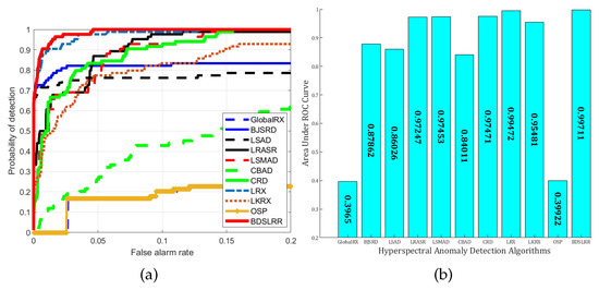 To demonstrate the effectiveness of the patch-based dictionary, we performed experiments when patch size was and (which means that there is no spatial–spectral constraint) on the four datasets. Results are shown in Figure 26 and Figure 27. From the ROC curves and AUC values, we can see that our patch-based dictionary learning method can improve the detection performance since it acceptably explores the spatial–spectral characteristics.