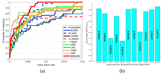 - The background joint sparse representation method for hyperspectral anomaly detection (BJSRD) [28]. This is a newly developed anomaly detection method based on sparse representation. Based on the sparse representation theory, the algorithm utilizes the redundant background information in the hyperspectral scene and automatically deals with the complicated multiple background clusters, without estimating the statistical information of the background.