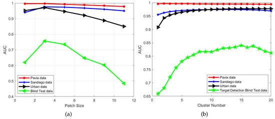 For the cluster number of the background, we set the range from 1 to 20 for all real-world datasets. As shown in Figure 25b, when the number equals 1 (which means that the whole data is employed to learning the dictionary without cluster), the AUC value is not high in any of the datasets. As the cluster number increases, the AUC values also increase. Since the background of the Pavia data is less complex, a cluster number of 6 can reach the best result. As the San Diego and Urban data have a more complex background, the best performance is obtained when the cluster number is between 12 and 17, but it decreases when the number continually increases. Through our experiments, we found that, when the number cluster is between 6 and 20, the detection performance is stable.