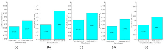 Without patch-based and patch-based AUC values. (a) Synthetic Dataset; (b) San Diego Dataset; (c) Urban Dataset; (d) Pavia Dataset; (e) Target Detection Blind Test Dataset.