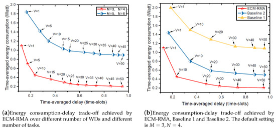 Figure 4b shows the energy consumption-delay trade-off achieved by ECM-RMA, Baseline 1 and Baseline 2. As expected, the proposed ECM-RMA algorithm is better than Baseline 1 and Baseline 2. In more detail, in the case of the same delay, the proposed ECM-RMA algorithm consumes less energy than Baseline 1 and Baseline 2, and this also means that the ECM-RMA algorithm has the lowest latency when the same energy is consumed. This is because, compared to Baseline 1, the ECM-RMA algorithm can allocate transmission time according to the dynamics of channel and the length of date queue. Under Baseline 2, the energy harvested by WDs is unstable, and WDs cannot compute tasks, instantly resulting in long delays when the same energy is consumed.