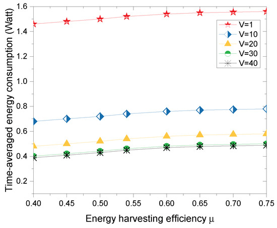 Figure 7 shows the time-averaged energy consumption versus the energy harvesting efficiency under different system control parameter V. The time-averaged energy consumption monotonically increases with the increase of energy harvesting efficiency . This is because the wireless harvested energy of WDs is a linear function positively correlated with the energy harvesting efficiency according to (16), and, as increases, more energy can be used for wireless data transmission. However, the growth rate of the time-average energy consumption slows down with higher . This indicates that the time-averaged energy consumption is also affected by the battery capacity and the number of available sub-channels in case of sufficient energy supply.