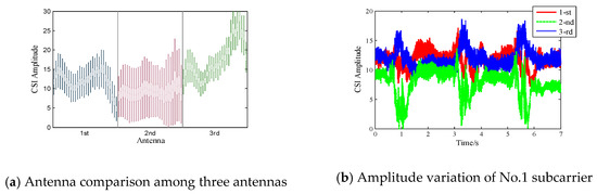 Qian et al. [28] firstly demonstrated the aptness of tracking human path using two appropriately selected antennas for the dominant Doppler shift. As is shown in Figure 2a, the boxplot of 7-second CSI amplitude data across all 90 subcarriers reveals the distribution of CSI amplitude. We observe that the second antenna, with lower average amplitude values, is more likely to produce larger dynamic responses. This indicates that the second antenna has a weaker static component and is more likely to be distorted by micro-movements. Figure 2b depicts the amplitude variation of the No.1 subcarrier received in three different antennas. We can see the second antenna possesses the most significant amplitude fluctuations compared with the other two antennas. Inspired by the above two observations, we select the most sensitive antenna as the reference from the three receiving antennas and only leverage its amplitude information to detect motion transitions.