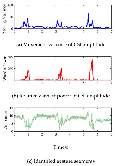 Finally, we normalize the value as pm[q] = Em[q]/Esum[q], which represents the relative wavelet power, detecting the signal distortions of interest without additional noise reduction. Specifically, when we set the transmitting rate at 500 pkt/s, the gesture-corresponding frequency components mainly exist in the DCs of the 6th layer. In Figure 3b, we can see that relative wavelet power is more sensitive to subtle finger movements, since it efficiently excludes the disturbance of irrelevant body movements. Moreover, it is resistant to environmental noise, while movement variance can be more sensitive. Therefore, we only need to predefine a simple threshold by empirical study to indicate motion transitions. In Figure 3c, it is obvious that the most discriminative signal fluctuations induced by finger gestures are preserved, while the irrelevant body motions are discarded, which demonstrates the efficiency of our proposed segmentation method.