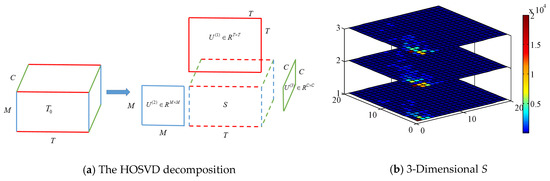 Bearing in mind that a color radio image is constructed with multi-dimensional relations, we aim to reduce irrelevant noises left over by fully exploiting tensor properties. HOSVD is an efficient tool to extract high-dimensional core component via performing tensor factorization, which is an extension of matrix SVD. The basic idea of HOSVD is to select the dominant eigenvalues by nullification of individual values below a predefined threshold [42]. Let us denote radio image as T0∈RM×T×C, C is the channel number. The HOSVD process of tensor T0 is depicted in Figure 5a, and its decomposition formula can be written as: