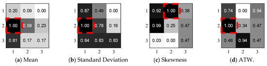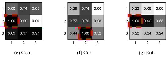 To demonstrate the aptness of three color features and four texture features, we conduct a simple experimental study by applying a 500 × 500 sliding region with step size 250 through the whole 1000 × 1000 image and extract 7 × 3 features from a total of nine segmented regions. To eliminate the feature dimensions, we normalize the feature matrix and aggregate the same feature of the same three regions. In Figure 6, we notice that different features show varied performance in different regions, revealing the image properties from a different perspective, while the (1, 2) region contains the maximum valuable features which are marked with red frames. Inspired by the above observations, we design a novel indicator which combines all color and texture features: