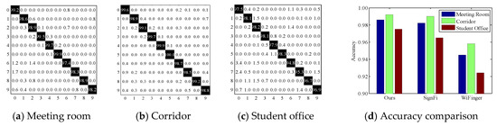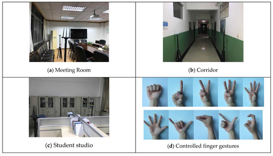 Environment and data collection. All experiments are conducted in typical indoor scenarios of an academic building, including a meeting room, a corridor and a student studio. As is shown in Figure 8a–c, there is a 6 × 6 m2 meeting room with a conference table and twelve chairs, a 2 × 20 m2 empty corridor surrounded by walls and a 6 × 12 m2 complex student office with two worktables, and multiple blocks and electronic interferences. We set the distance between laptops as 2 m, 1 m and 3 m, respectively, and fix the height of the antennas at 1.3 m. Eight male and two female student volunteers perform controlled finger gestures as illustrated in Figure 8d. All volunteers major in computer engineering, and have ages between 22 and 35. When CSI collection begins, the participant is asked to follow the instructions given by a recorder, step into the wireless environment and arrive at appointed locations. Then the recorder randomly gives the command number from 0 to 9 and records the digits, while the participant continuously performs the finger gestures with the body stationary. During the experiments, every participant performs each gesture by following similar steps: raise the right hand, stretch fingers, retract fingers and put down the hand. We collect a total of 300 instances for all 10 volunteers in all 3 scenarios within a 3-week period. Each instance contains 20 action segments covering all 10 digit gestures with short breaks. In the training stage, we use 50% of the records for all 10 volunteers to train the CNN model and the remaining 50% of the records to test the performance.