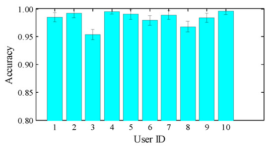 Impact of user diversity. To evaluate whether our system works consistently for different users, we employ 10 volunteers of different genders, heights, weights and body mass index (BMI). Table 2 shows the statistics of the participants; User ID 1 to 8 are male, and User ID 9 to 10 are female. We also present the recognition results of all participants in Figure 10. As shown, DeepNum is able to handle diversity and achieve robust recognition for all individuals with an accuracy higher than 95%. However, there is no direct correlation between user diversity and accuracy. We leave further study of this for our future work.