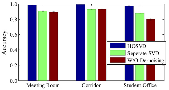 Impact of image de-noising. We also check the influence of HOSVD, which reduces the noise in the radio image. In Figure 13, without any de-noising step, the average accuracies are 83%, 85% 78% for the meeting room, corridor and student office, respectively. This implies that the radio image is built up from sensitive and robust information. Applying SVD in each matrix helps a little in overall accuracy, but if we perform HOSVD from a high-dimensional perspective, the accuracy can be improved significantly, especially in NLOS environments. The reason for this is that HOSVD is able to manipulate multi-channel correlation simultaneously, so slight motion-induced distortions can be captured even in a noisy environment.