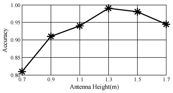 Impact of antenna height. To determine the perfect height of the antenna pairs, we conduct experiments at heights of 0.7 m, 0.9 m, 1.1 m, 1.3 m, 1.5 m and 1.7 m. Figure 14 plots the performance of DeepNum. Under the initial condition, DeepNum has its lowest average accuracy of 81%, due to irrelevant body movements and severe multi-path effect. The accuracy climbs to a peak as the antenna height reaches 1.3 m, with a strong reflected signal. We also notice that DeepNum consistently yields high accuracy at a height of 1.7 m. Therefore, DeepNum could work well in real indoor environments, since most Wi-Fi devices are placed on the ceiling.
